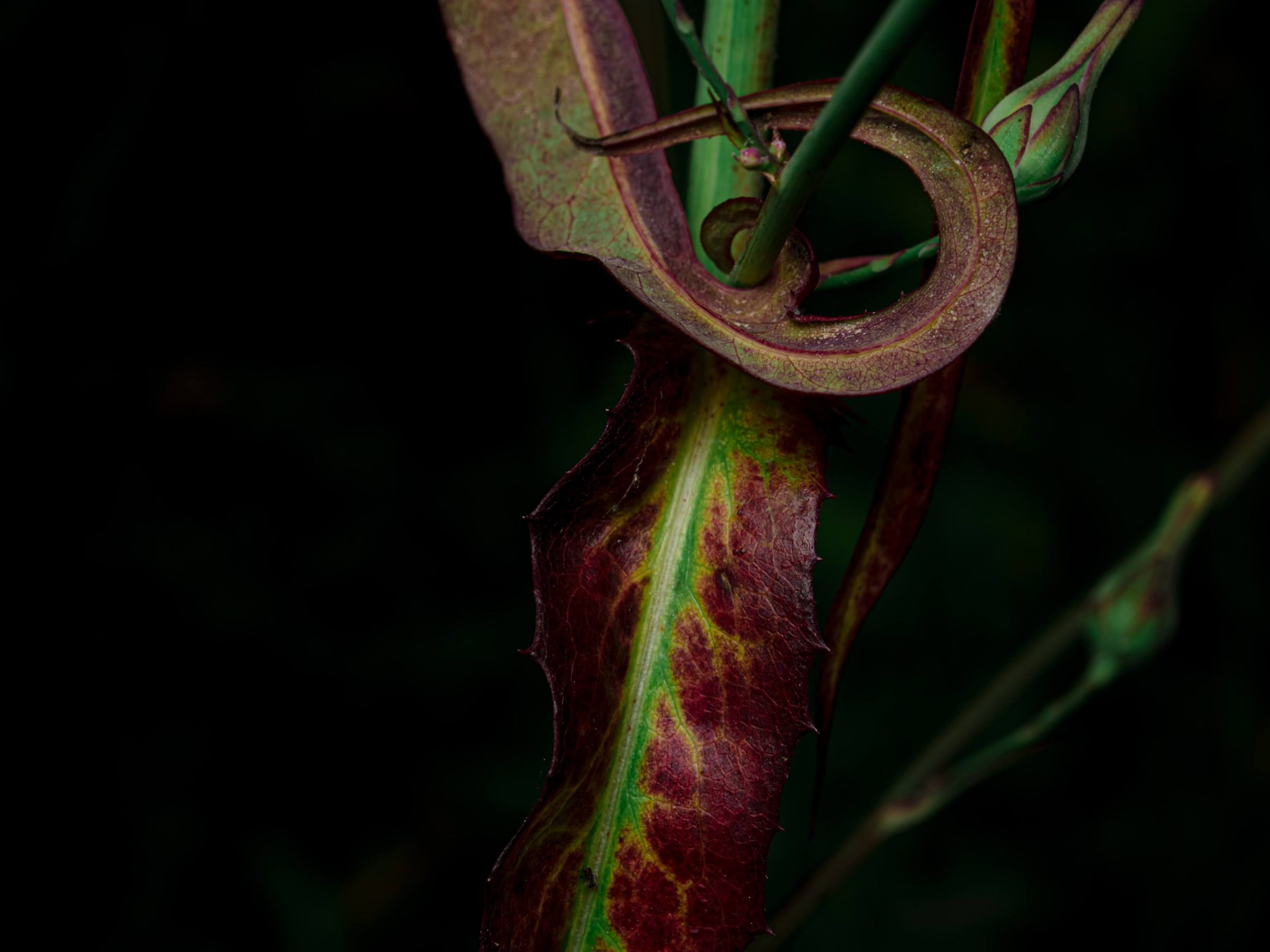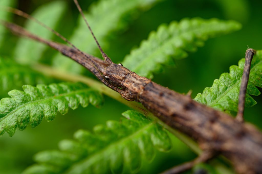 いつものトゲナナフシだが、路上の100%轢かれるポジションで平たくなったので、周辺のシダの上に適当に捨てたついでに撮影してみた。