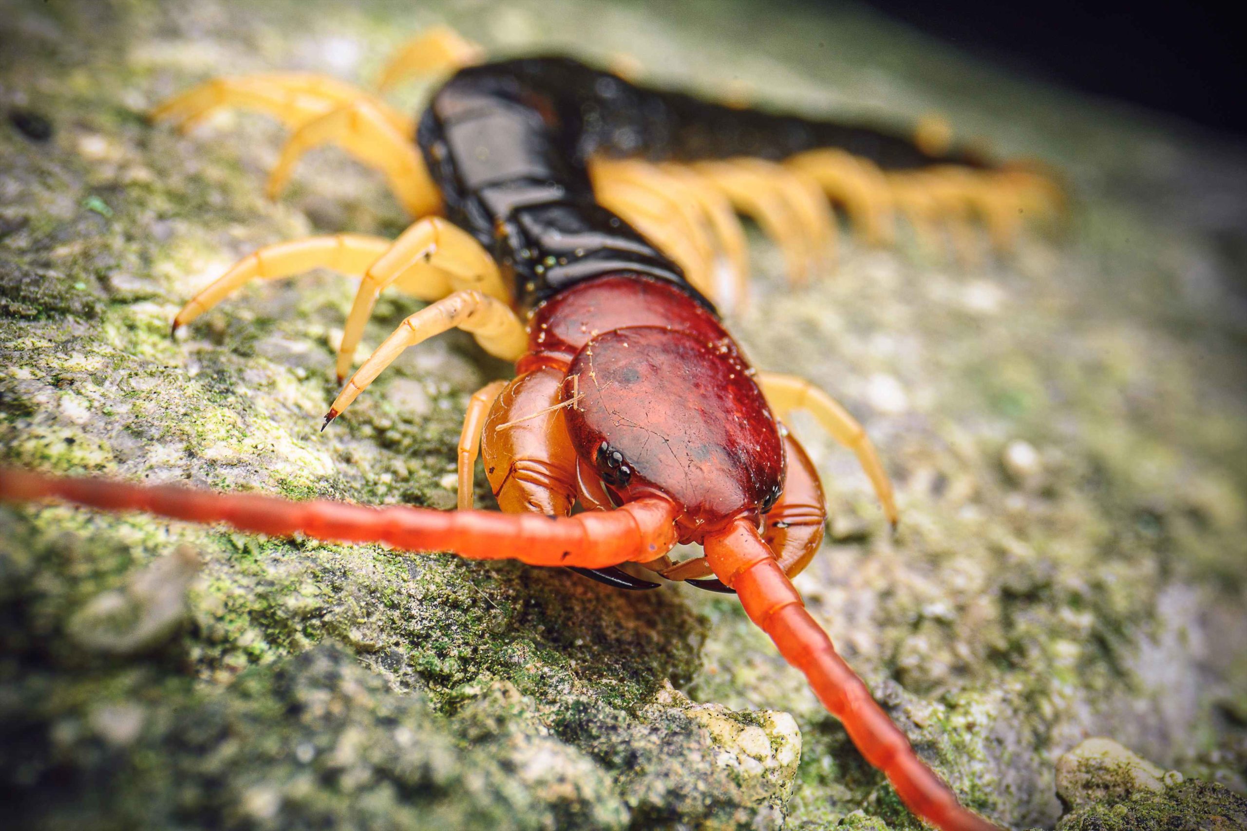 毛虫を捕らえたムカデ。