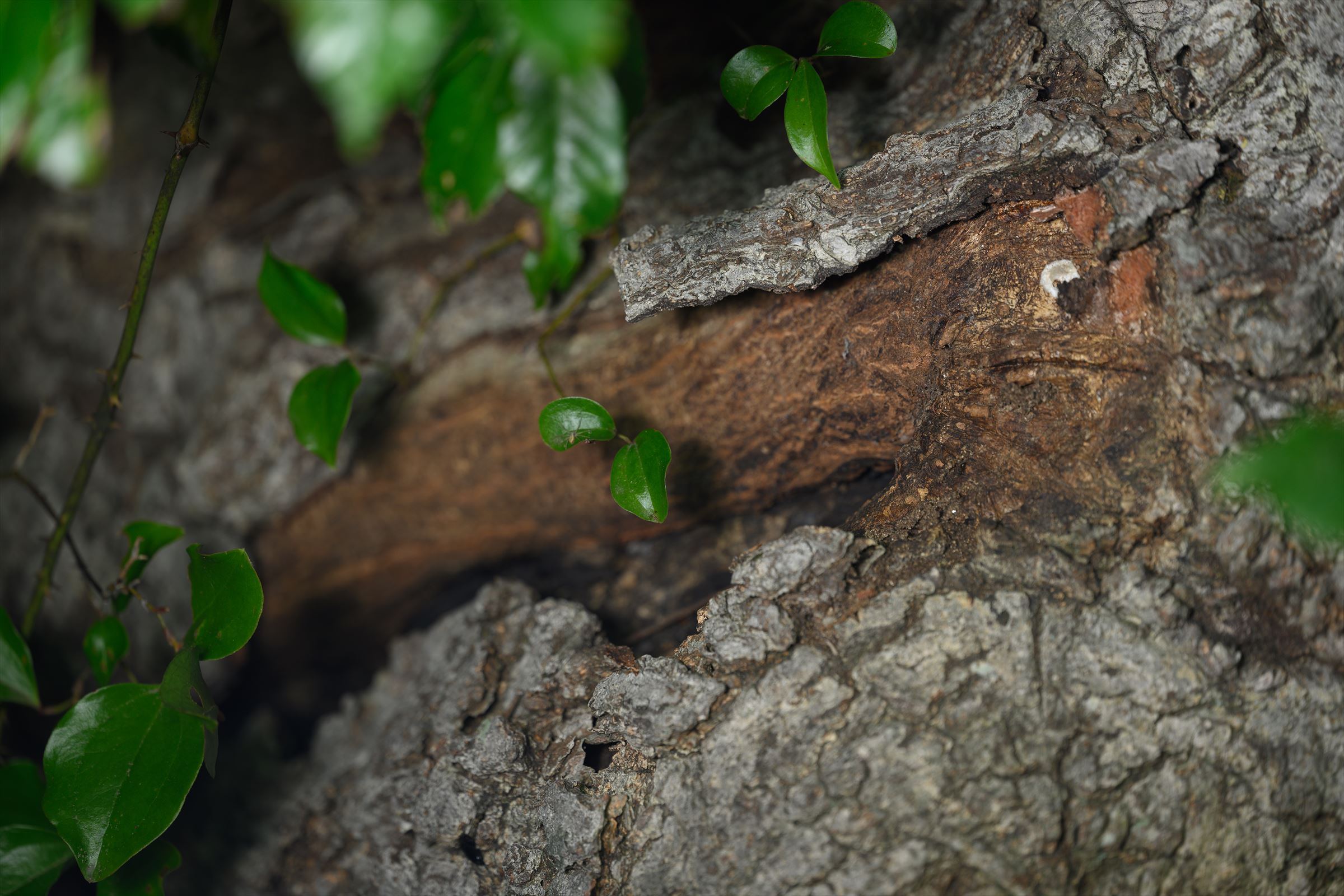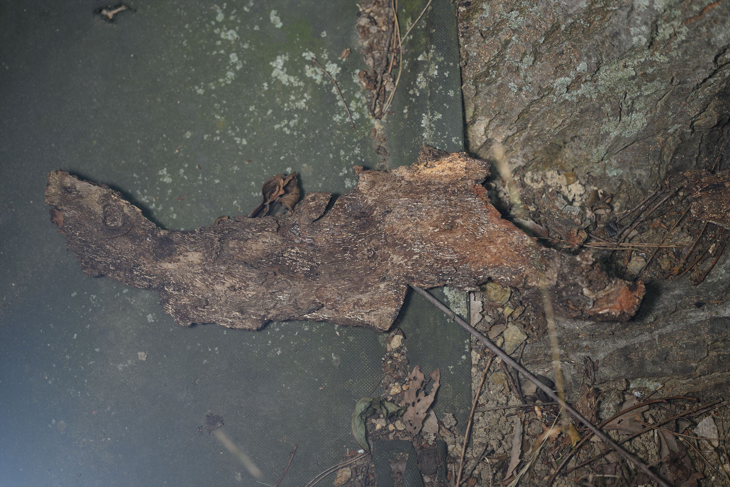 自然に落ちたものじゃなさそうな雰囲気あるんだが。(1枚目は左が下なので、画面上の樹皮は下から上へ捲られてる浮き方。)