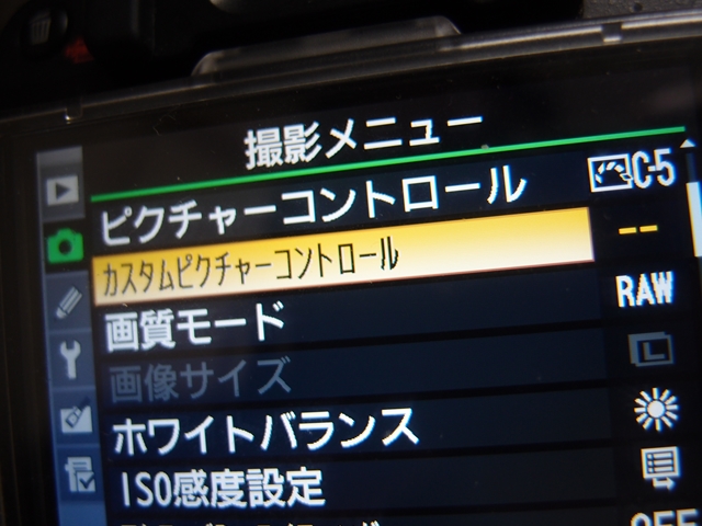 D90の撮影メニュー、カスタムピクチャーコントロールを開く。