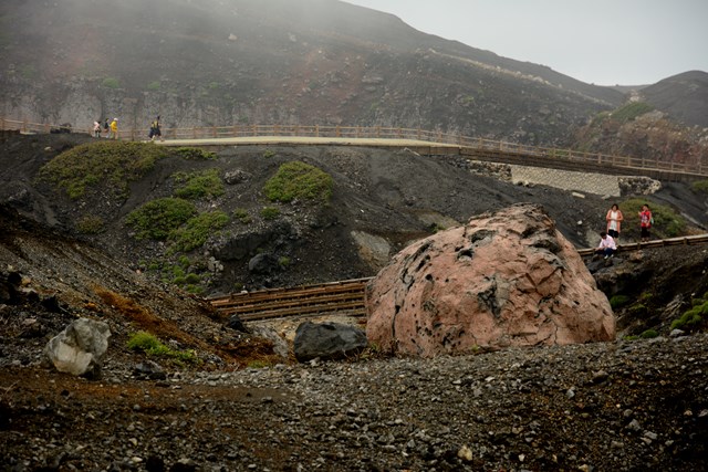 なお、大野さんの言葉を借りると「火山ガスを吸うと、心臓病や喘息の人は死んでしまうし、健康な人でも1時間ぐらいはむせますよ。」との事。幸いそう言った意味では南からの風と雨のおかげで殆どガスを吸う事がなかったので、「かすかにガス臭い…かな?」程度で済んだのはラッキーと言えばラッキーかもしれない。(火口と火口観察ポイントの位置関係上、西や北から風が吹いてるとがっつりガスを吸う事になりそう。)